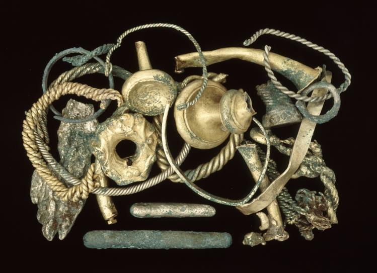 However, when shown to contemporary goldsmiths, several different possible explanations have been offered. The first would suggest that these are pieces of material strung together, in relevant different alloy percentages, ready for melting. For example, if taken as a whole group, BM 1991,0501.1–5/BM 1991,0501.53–59 by weight is c.30% silver and c.70% gold alloy and the group BM 1991,0501.103–108 is 6% silver and 94% gold alloy, by weight. Others are 100% silver (BM 1991,0501.14; BM 1991, 0702.29–30) whilst others are 100% gold alloy (BM 1991,0501.167–168; BM 1991,0501.160–161; BM 1991,0501.66–72; BM 1991,0501.62–65; BM 1991,0501.46–51; BM 1991,0501.6–13). Some show ternary (gold, silver and copper alloy) alloy selections (BM 1991,0702.10–12; BM 1991, 0501.216), with a few groups capable of creating silver rich alloys with copper alloy (BM 1991,0501.209) or gold (BM 1991,0501.206–207; BM 1991,0501.140–143).