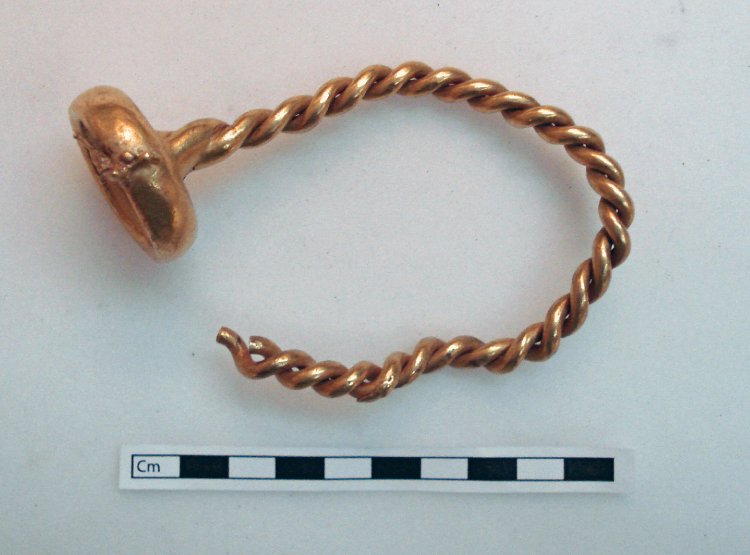 Hoard A included four gold tubular torcs and a perforated gritstone pebble; Hoards B/C (which were mixed after finding) contained fragmentary material, including torcs, pieces of torc, coins, wires, bar ingots, ring ingots, ‘bracelets’ and metal ‘cake’ (an older term for a roughly shaped piece of metal that has previously been melted). In at least one case, and similar to items found in Hoard F (see below), several items were strung together on a ring ingot/bracelet. Hoard D comprised a complete two-bar twist, ring terminal torc with an ingot ring threaded through one terminal; Hoard E contained the Great torc and associated bracelet, buffer torc and coin (Brailsford 1951; Clarke 1954; Stead 1991).