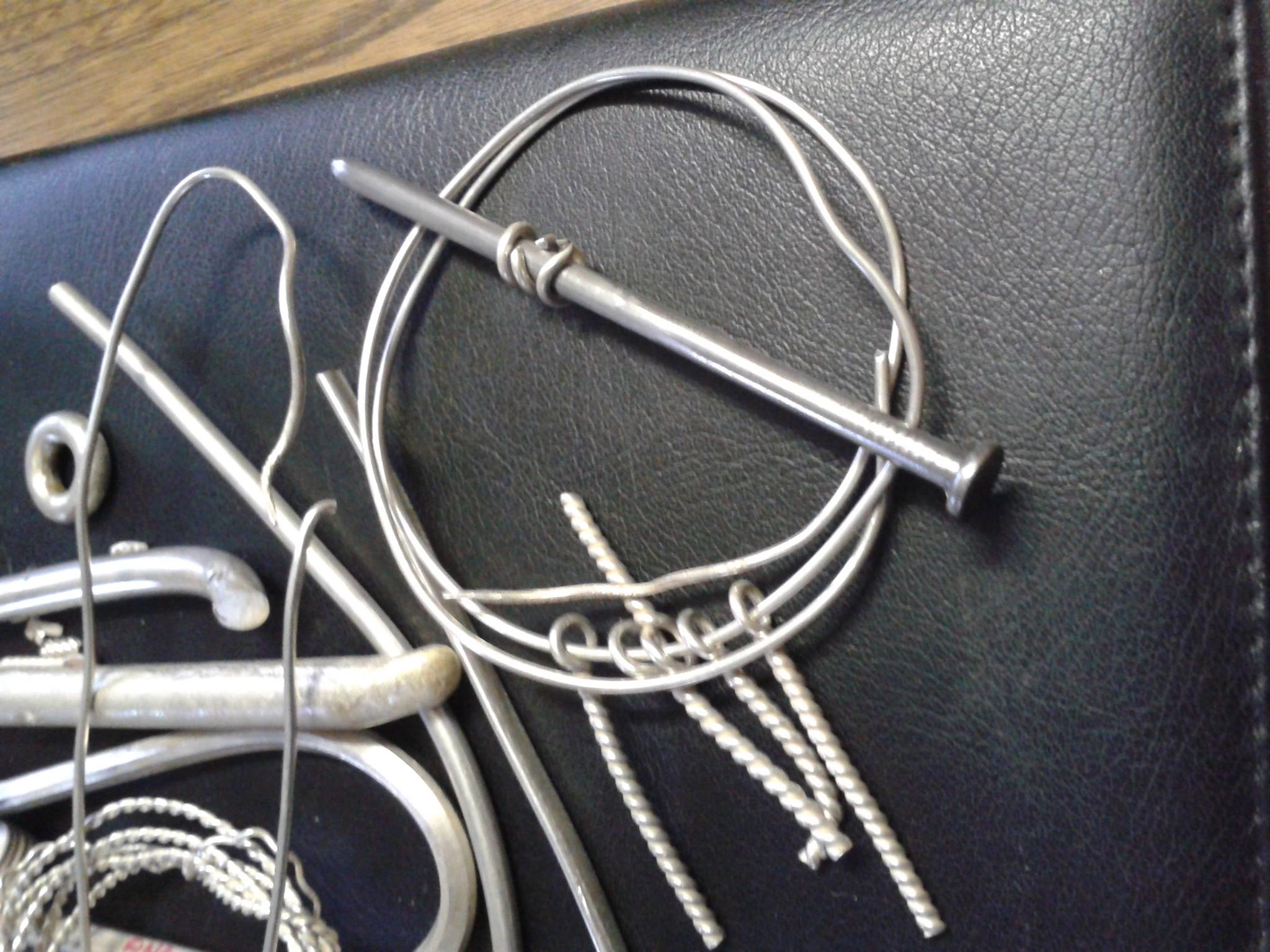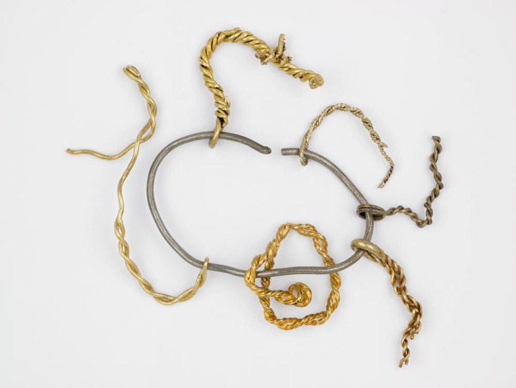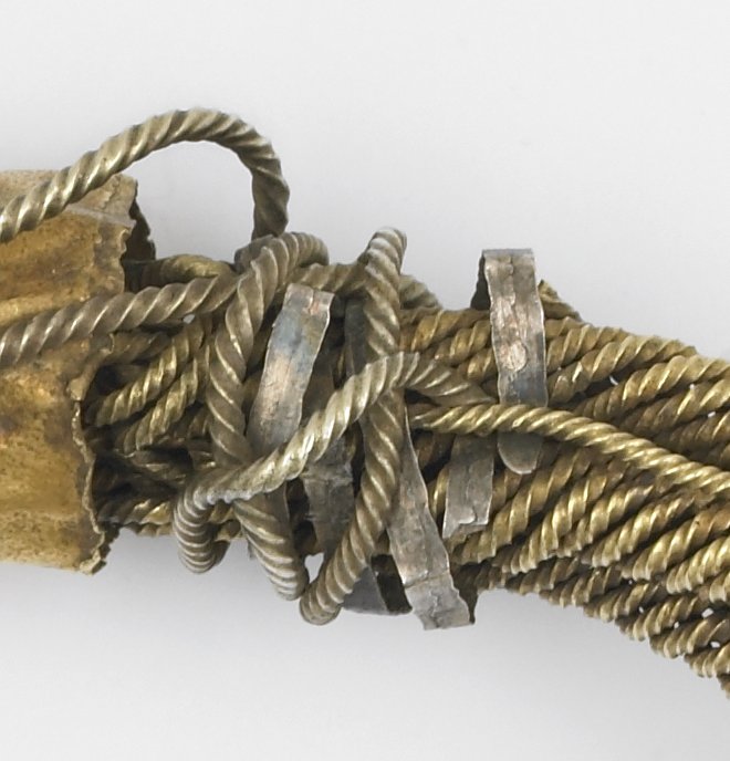 In addition to the ‘alloy grouping’ possibility, a further metalsmithing explanation for the BM 1991,0501.109–113/BM 1991,0702.3–4 assemblage has been suggested by several goldsmiths. They have pointed out that such ‘swatches’ of wire are commonly used by gold- and silversmiths as a means of showing clients the range of wire twists and formations that are possible. One of the craftspeople, Bob Davies, also suggested a use as an aide-mémoire of previous work and how it was achieved. Bob backed this up with a photo of such a swatch from his ‘scrap drawer’ and the similarities of this swatch to BM 1991,0501.109–113/BM 1991,0702.3–4 are remarkable (Fig. 21).