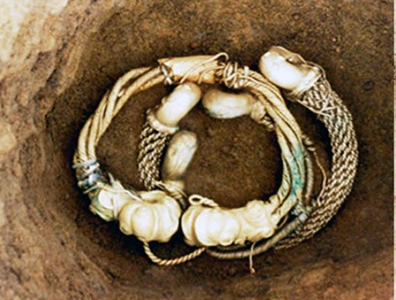 Above this torc lay the Grotesque torc (BM 1991,0407.37) which, as described above, shows repairs with square cross-section, twisted wire, silver strip wire, a section of two-bar torc and a section of gold tubular torc.