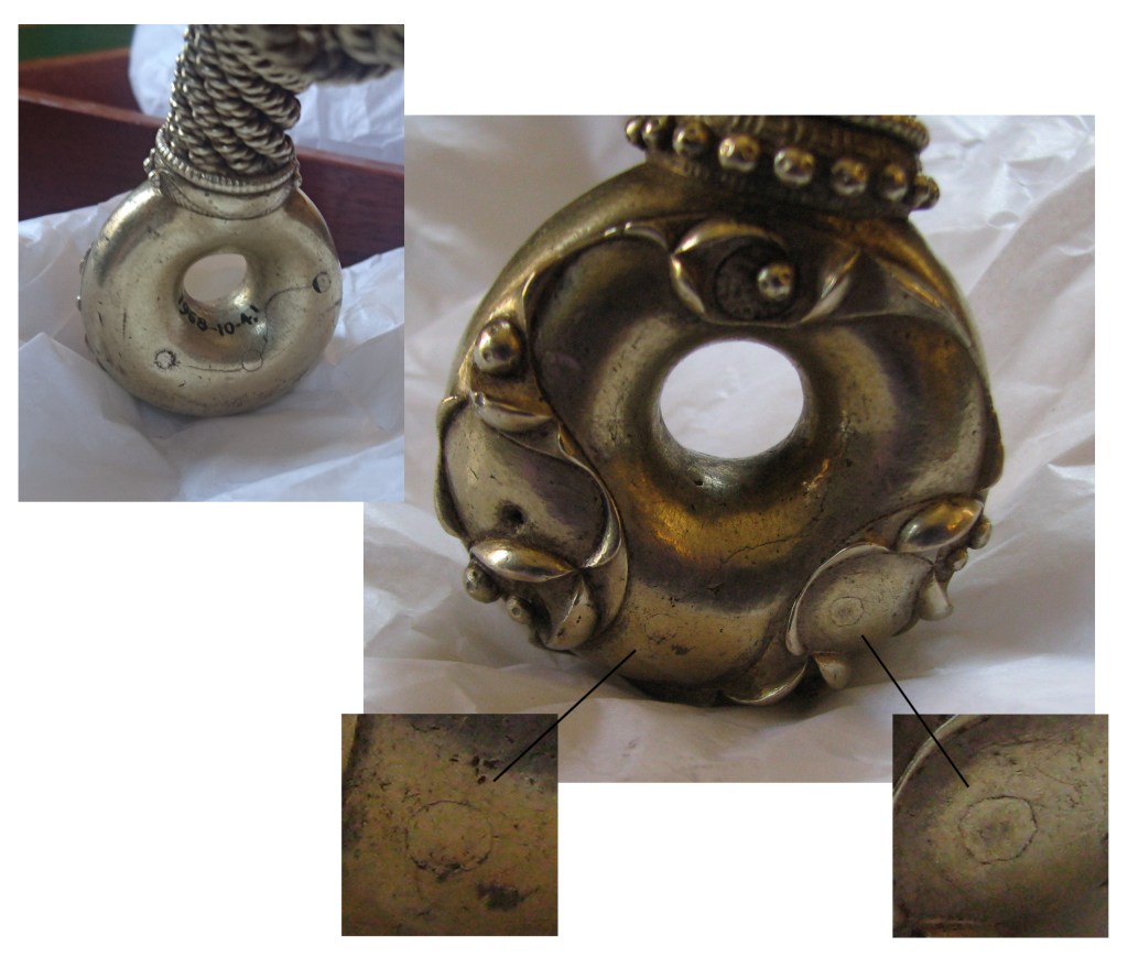 In the case of the Snettisham Great torc, although the repairs are not as well achieved as perhaps the Torrs pony cap and its ilk, the use of solder points to them having been carried out by someone with a good knowledge of goldworking (Machling & Williamson 2019b, 193). Both Sedgeford terminals apparently cracked during casting and were deftly and invisibly repaired (Fig. 14) using multiple, and alloy matched, fine gold alloy rivets (Brailsford 1971, 17; Machling & Williamson 2020). In both the Great and Sedgeford torcs these repairs were not designed to be seen. For example, on the decorated faces of the Sedgeford terminals, the rivets are almost impossible to see as they have been so well blended into the terminal shell (Fig. 15).