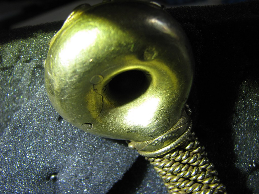 The ‘wear-related breakage’ argument is also improbable if thought about in the context of multi-strand torcs. In such torcs, the pressures of opening and closing would be shared across many wires and, should one wire break (perhaps due to a flaw) then there were many more left. Even if more wires broke, still more would continue to hold the neck ring together. One would also expect an attempt at repair before the problem got too bad. However, in the case of the Grotesque torc, it was only when all 36 of the wires (32 spring wires and 4 twisted wires) had broken that any attempt was made to repair the torc. It could be argued that repair of a torc was perhaps in some way taboo, although the repairing of many other torcs, and indeed the final repairs to the Grotesque torc, would strongly suggest this was not the case.