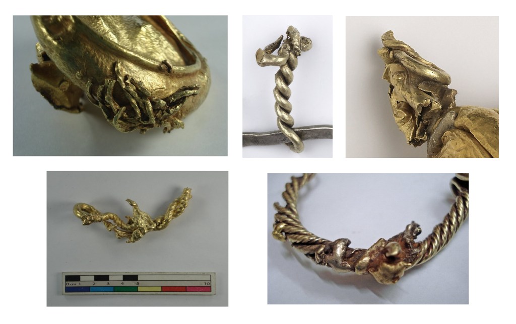 When the items above are compared with the repairs seen on the Grotesque and other torcs from Snettisham Hoard L, the difference is starkly apparent: the Hoard L repairs were carried out with reused/scrap materials with no evidence of metalworking techniques or metalworking skill: these were temporary, unskilled and expedient repairs almost certainly carried out by hand and without the use of any tools. We would argue that, when compared to other Iron Age items, the Snettisham repairs are very much atypical in Iron Age metalworking and, as will be argued below, were perhaps the result of a one-off, very immediate, requirement to fix the torcs prior to deposition, using materials to hand at the time, and carried out by people with little or no metalworking knowledge or skill.