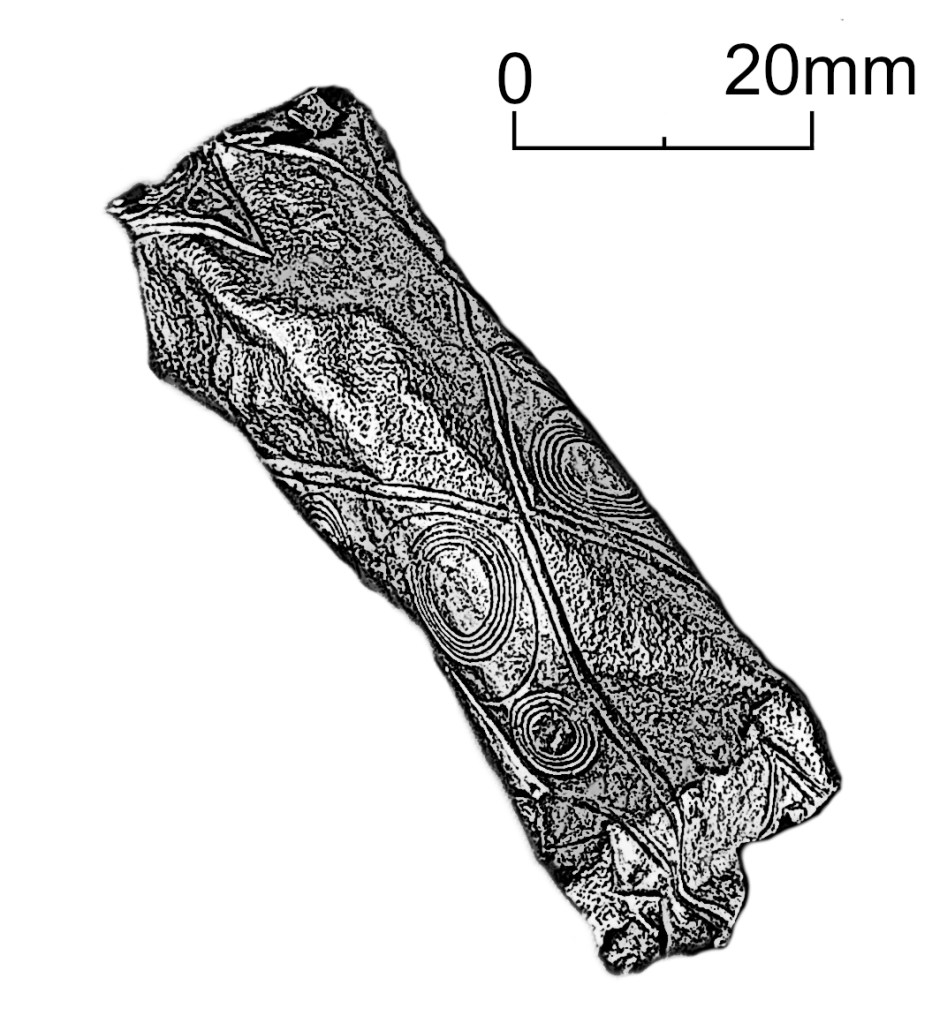 However, in addition to Jope’s criteria, an extra decorative technique and motif can be seen. Running along both edges of the ‘bracelet’ are parallel lines with recurring semi-circles (Fig. 1, g). Each end of the semi-circle is punctuated with a punched dot. In contrast to lines seen elsewhere on the ‘bracelet’, and on torcs, the parallel lines and semi-circles appear to have been inscribed, rather than punched, and are considerably finer than the punched lines seen elsewhere in the decoration.