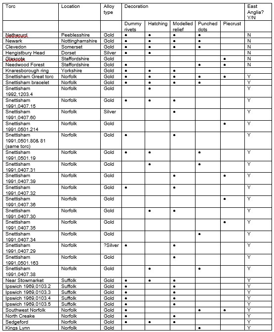 When counted, the number of identifiable ‘Snettisham style’ decorated torcs/parts of torcs recovered from across Britain is illuminating (Table 1). If gold, silver and copper alloys are taken into consideration, at first glance, East Anglia dominates. There are twenty-two examples from East Anglia (including Snettisham examples, five Ipswich torcs and the ‘Southwest Norfolk’ and North Creake torcs) whereas, only five torcs from beyond East Anglia (Netherurd, Newark, Clevedon, the Knaresborough Ring and Hengistbury Head) are decorated with at least one of the decorative elements identified by Jope.