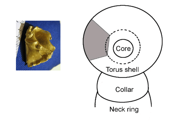 In 2015, we initiated our research into the manufacture of Iron Age gold torcs. Since that time we have published a number of papers, blogs and articles (Machling & Williamson 2016, 2017, 2018, 2019a, 2020a-c, 2022, 2023 etc) on the topic, detailing how many gold torcs, instead of being manufactured with the previously assumed cast-on terminals (see MacGregor 1976, pl.191; EluĆØre 1987, 34; Stead 1991, 454; Jope 2000, 253; Hautenauve 2004, 120ā1; Cartwright et al. 2012, 26ā7; Meeks et al. 2014, 150ā51; Joy 2015, 41; La Niece et al. 2018), were in fact created from hand-worked sheet gold, using a three-part construction technique of a torus shell, core and collar (Fig. 1).