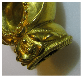 In many torcs, including the Sedgeford torc and many of the Snettisham examples, evidence of casting cracks can be seen. These cracks have sometimes, as on the Sedgeford torc (Fig. 28), been intricately repaired using rivets and infilling gold. The cracking, and subsequent repair, can also be seen on other Iron Age cast items, for example horn-caps. However, the Newark torc terminals are unique amongst all other known hollow cast terminals in that there are no cracks or faults in either terminal.