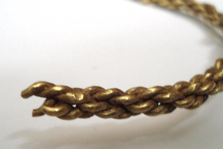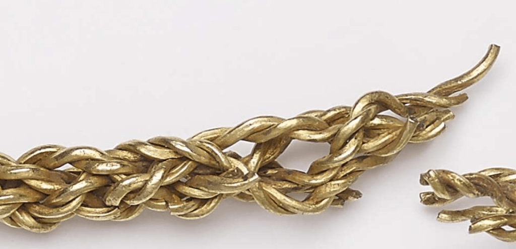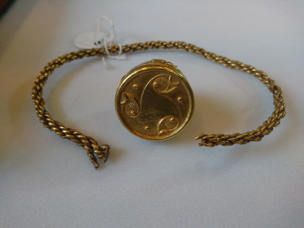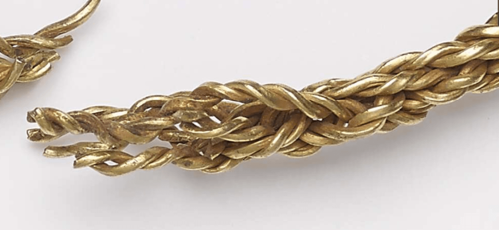 The British Museum catalogue suggests that the pairs of wires have been plaited – rather than twisted – together which seems likely. A close up look will tell. But whatever the case, this wire neck ring has been carefully achieved and with skill: despite appearances, getting an even twist on gold wires is not straightforward: the gold ‘work hardens’ with each twist and even with wires of around 1mm thick, they go stiff quickly and want to warp, rather than sit correctly and so need to be regularly annealed (heated and cooled). So yes, even something apparently this simple really isn’t unless you know that you’re doing… Iron Age goldsmiths certainly knew what they were doing!