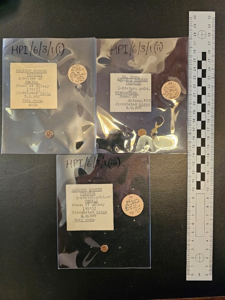 The typed notes and hand written labels included with each coin (written by Harry Price), confirm that all three coins were found in 1913, and so their ownership by Price predates the loss of coins in 1923. Harry’s assertion that he ‘had a fine and rare collection of the ancient gold coins of the Sussex princes…stolen from Pulborough church. The coins included those of Tincommius, Verica, and others. Some were unique…’ (Price 1942, 51) suggests strongly that these coins were part of that stolen collection. We would again draw the reader’s attention to the likely weight of the stolen coins: between 50.5g-70.5g, the weight of the ‘Pulborough Area’ torc being 57.54g (Machling et al 2023, 28).