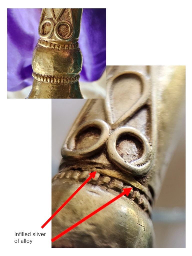 In addition, as described in our 2023 paper – but apparently unrecognised by the British Museum team – there appears to be a sliver of infilled gold alloy between the collar and neck ring (Fig. 1 & Machling et al 2023, Fig. 21, top middle; and clearly visible in Adams et al 2024, Figs. 2.2 and 3.1) which seems to be of a different colour to the rest of the torc and which appears to post-date the compiling of the torc body as it overlays the chiselled false-beading, and yet underlays the applied wire. The difference in colour suggests that it might be of a different alloy composition. This would be an important feature to analyse with XRF.