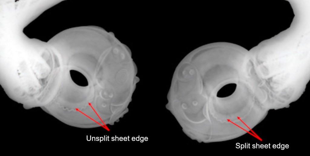 From the x-rays of the ‘Pulborough Area’ torc, the splayed collet within the collar cannot be compared with that of the Snettisham Great torc (Fig. 5). In the case of the Snettisham Great torc, the splits are ragged and haphazard and can only be seen on one of the two terminals, suggesting that it was not a manufacturing feature, but more incidental as a cracked and overworked sheet margin (Machling & Williamson 2023, 9). The x-ray images of the Pulborough torc collar show a very intentional cutting and splaying of the collet (Adams et al 2024, Figs. 7.2a & 7.3), the Snettisham Great torc does not.