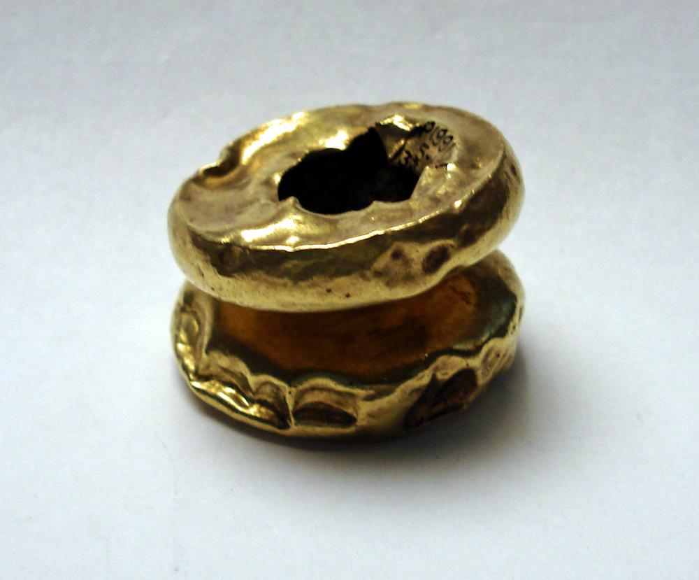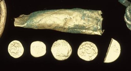 Torc F53 looked like it had been bitten to seal the end of the tube, which had contained five gold coins (Fig. 5) when originally found […and yes, I did nearly sing ‘five go-old rings’ then…].