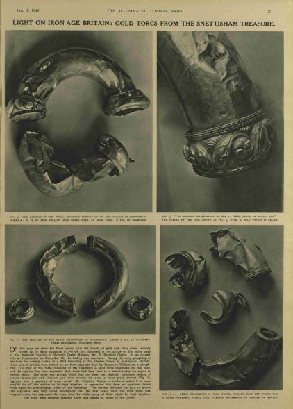 While I was perusing the Snettisham volumes, I happened to notice an image of a tubular torc from Hoard A at Snettisham, torc A.1. This torc was found by Ray Williamson in 1948, one of the first torcs found at Snettisham. When found – as can be seen from a 1949 newspaper article and from a photo in a paper by Clarke from 1951 – this torc was pretty bashed up (understandable really for a gold tube made from sheet only about 0.1mm thick):