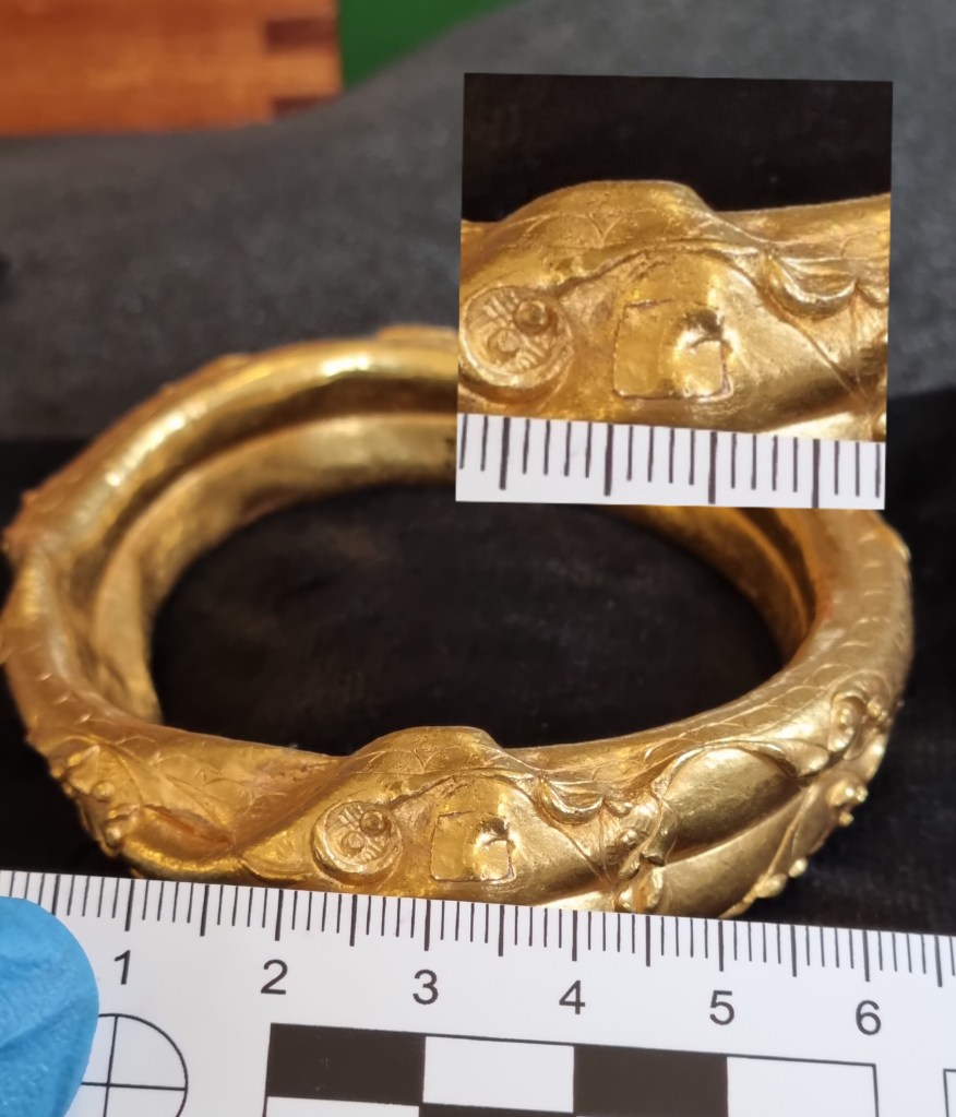 I’ll be honest in that I really wasn’t sure what to make of the armring patch when I first saw it. It really didn’t look right for an ancient repair and had an element of clumsiness to it that I wouldn’t expect from an Iron Age goldsmith: for one, it was square, which is a really weird shape for the Iron Age. Also, Iron Age patches tend to be riveted or soldered over the top, whereas this just appeared to be an inserted square of gold alloy, soldered shut around the edges. I also couldn’t see a reason that would require such a patch: even a caved-in sheet form could be righted without resort to taking a chunk out! An early 20th century conservation activity had crossed my mind…