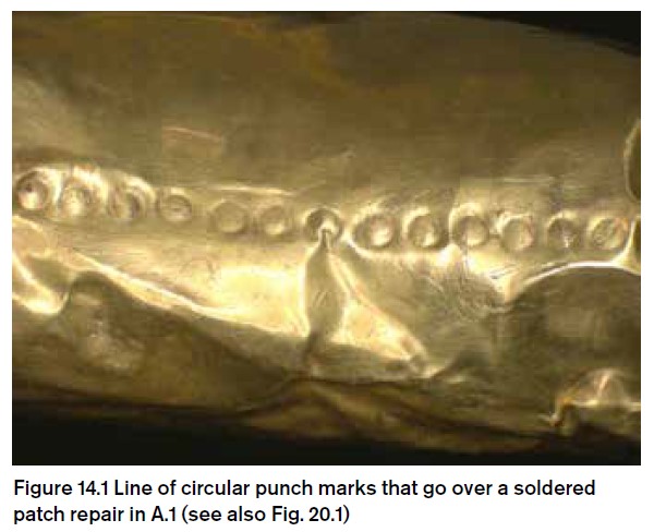 I had seen a similar patch before on the Snettisham Hoard E.1c armring, which had been found attached to the Snettisham Great torc. The armring has a small square patch on the exterior face of the bracelet and, although the armring patch is slightly smaller than the torc A.1 patch (this patch appear to be about 10mm x 10mm, whereas the armring patch is only about 5mm x 5mm) they are comparable in shape and technique.