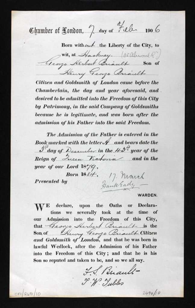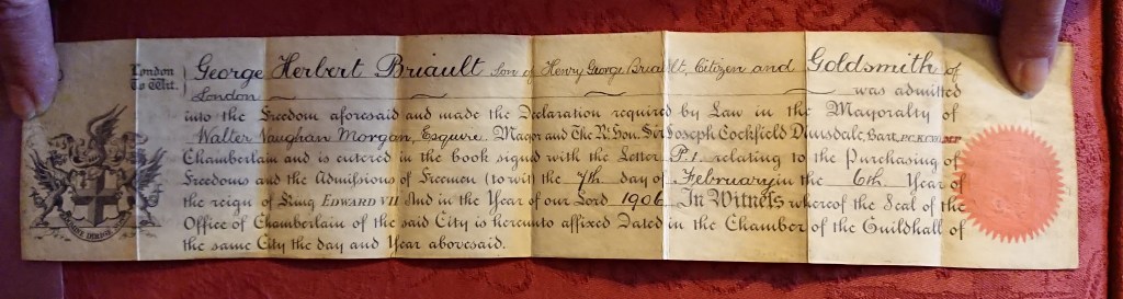 We have documents, going back to Lewis George Briault in 1788, that show that father to son – for at least 200 years – were members of the Goldsmiths’ Company and given the Freedom of the City of London, with all the sheep driving privileges that that entailed!! Unfortunately, that goldsmithing tradition ended in 1926, when my great-grandad George Herbert died, at only aged 40, from complications of pulmonary tuberculosis: the family story being that he was earlier gassed, whilst working in skilled munitions, in the first World War.