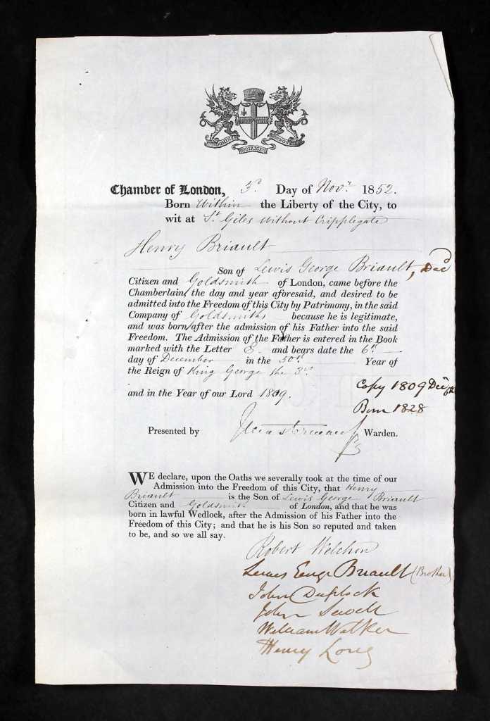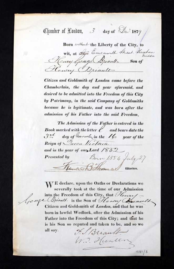 John/Jean’s son, Lewis George was born in 1788, and apprenticed as a goldsmith in 1802, and Lewis George’s son, Henry (born in 1828), was apprenticed and working as a silversmith in 1851. I don’t have much detail about the lives of these early Briault goldsmiths, apart from knowing their profession and that they were working in London, mainly in the Spitalfields/East London area.