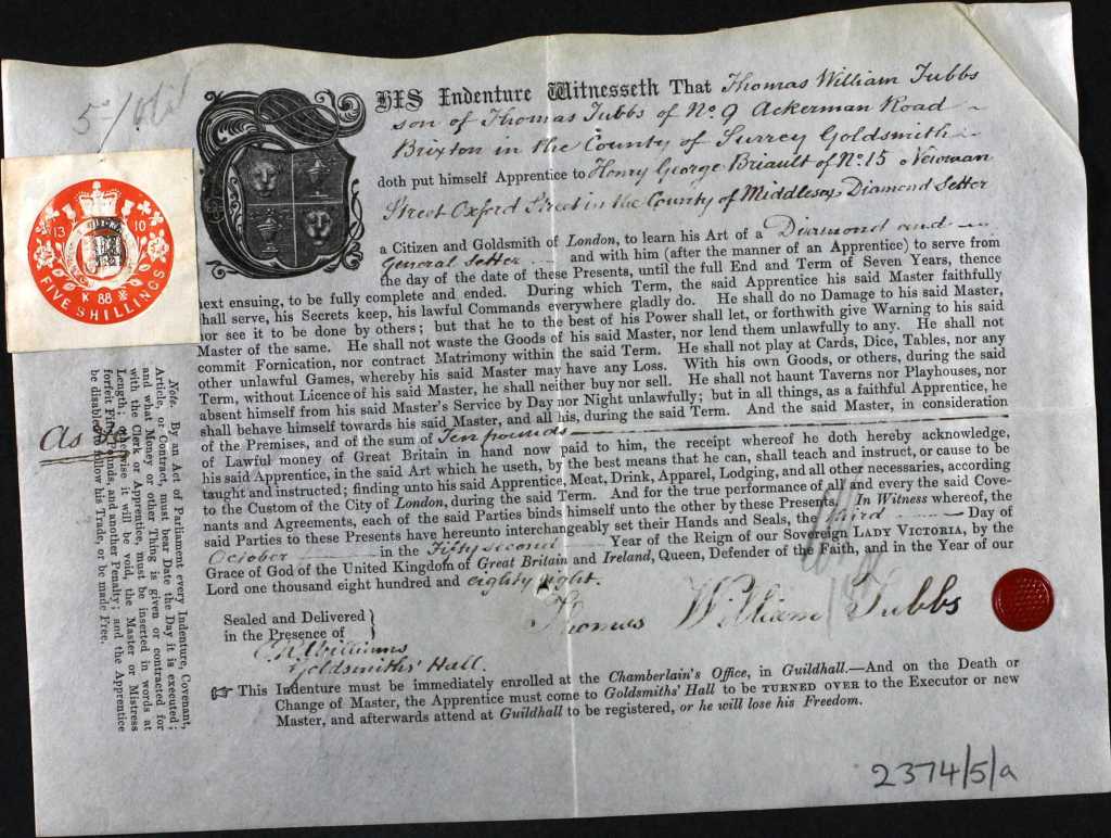 In 1854, Henry’s son, Henry George, was born, and seems to have followed the family tradition, being named as master to a Thomas Tubbs in the latter’s diamond setter apprenticeship documents from 1888.