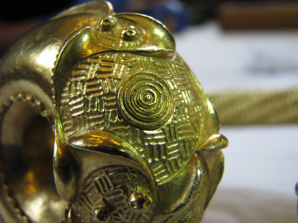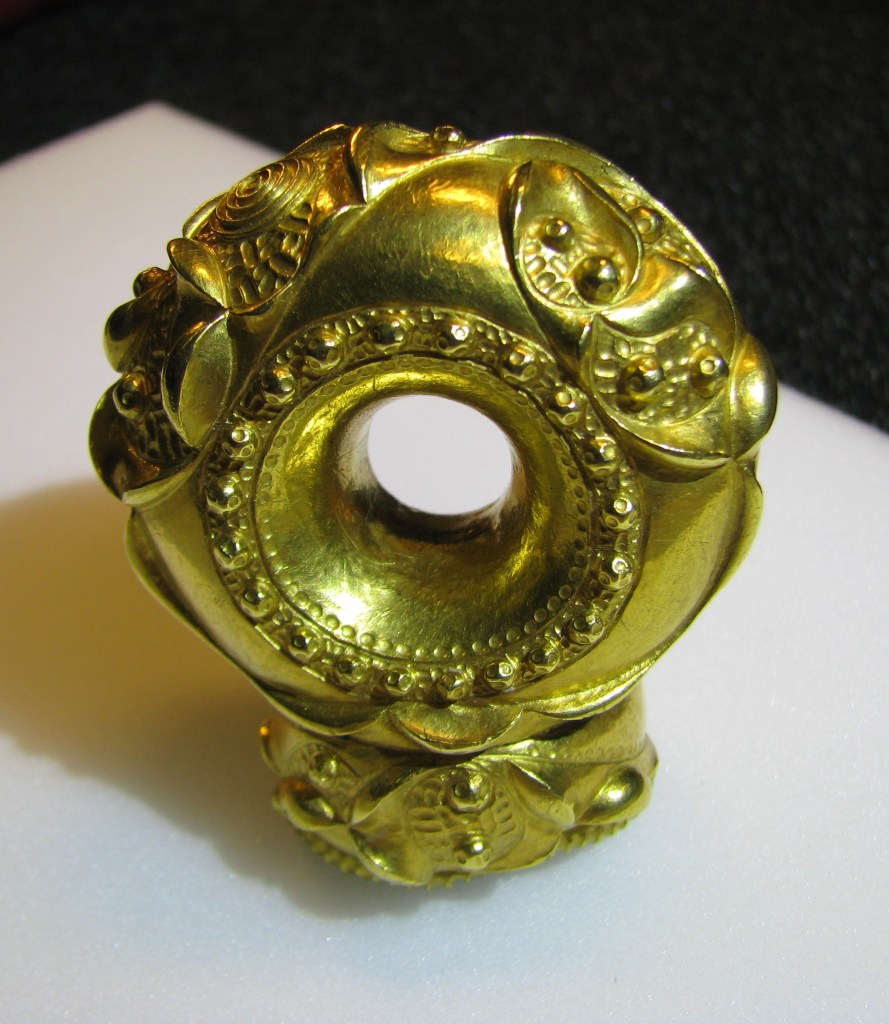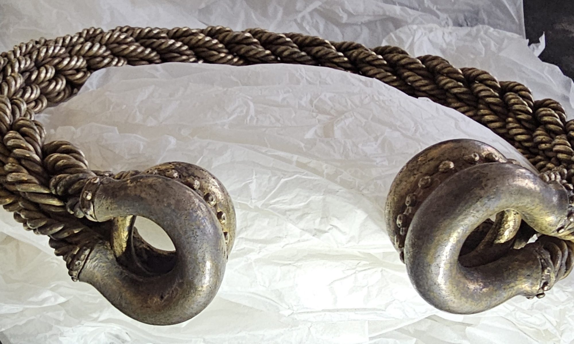 The gilding/surface treatment is however an oddity and that will take some pondering: if it is of a lesser quality silver rich gold alloy, or indeed is gilded, taken in conjunction with it apparently being made by the same Netherurd and Newark maker/finisher, it would suggest that the quality of gold alloy available to the maker varied from torc to torc. This matches with the high quality sheet gold used to make the Netherurd terminal and the hybrid casting/hammering method seen on the lower quality gold Newark torc. Is torc H7 yet more evidence that makers were skilled in a number of different techniques and that, rather than colour selection – as has often been assumed by others – the availability of alloys may have been more significant in deciding the final design and method?