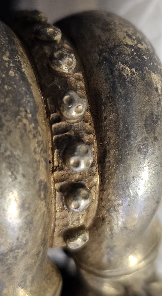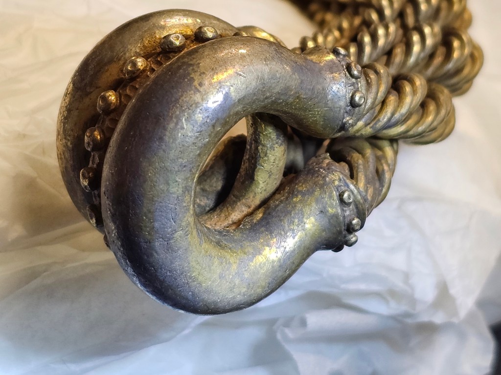 Snettisham torc H7 is yet another wonderfully intriguing torc that, under close examination has revealed some, but not all, of its secrets. Initially thought to be by the same maker/finisher as both Newark and Netherurd, I am satisfied that the punch marks, dummy rivets and the level of skill in making suggest this is highly likely. It has that chunky confidence that I’ve seen before in Netherurd and Newark and enough absolute comparable elements to confirm this feeling.