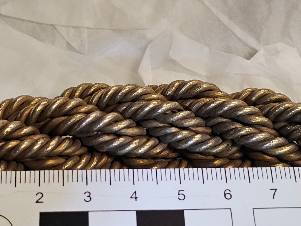 The torc is a multistrand torc and the wires of the torc are each between 1.9mm-2.2mm in diameter (Note: the British Museum suggest that each wire is 1.2mm in diameter. This is incorrect) and there are three wires in each twisted strand, and three strands in each rope (Fig. 2). There are four ropes, one secured to each attachment point on each terminal. In total there are thirty-six wires.