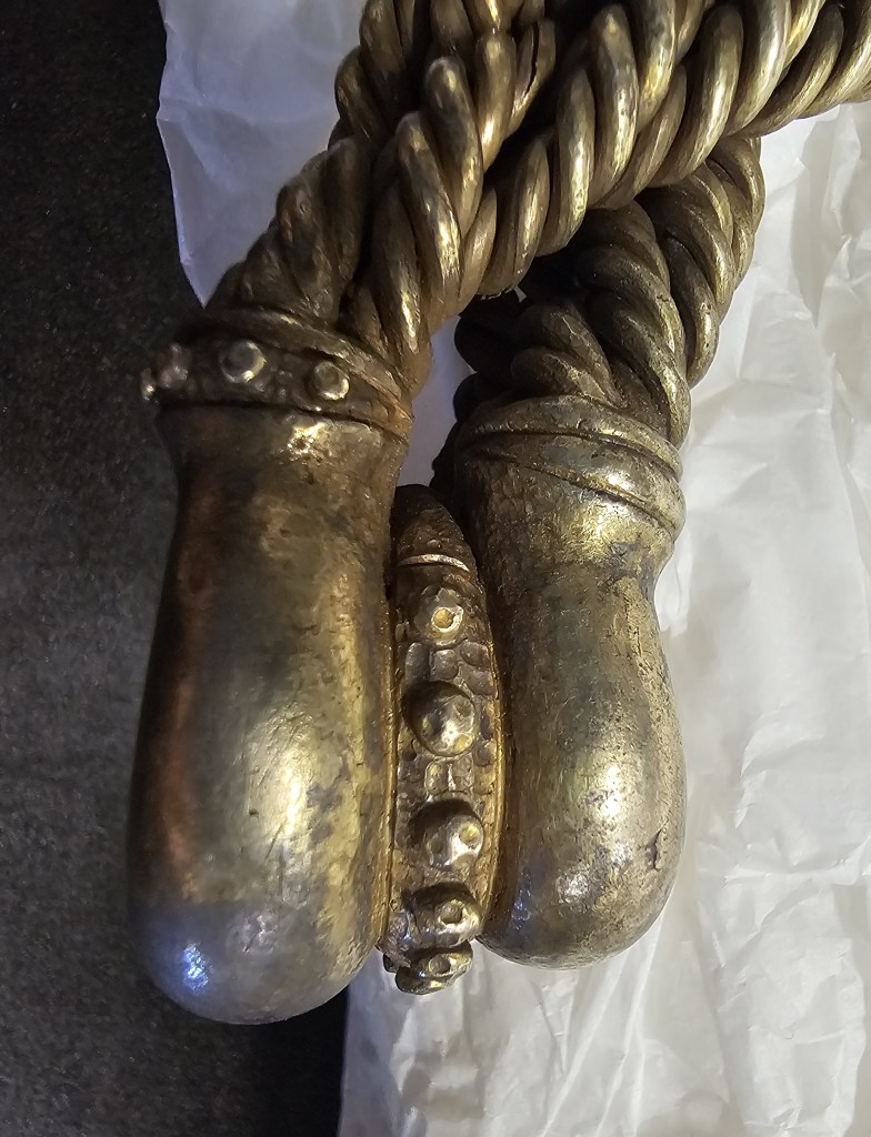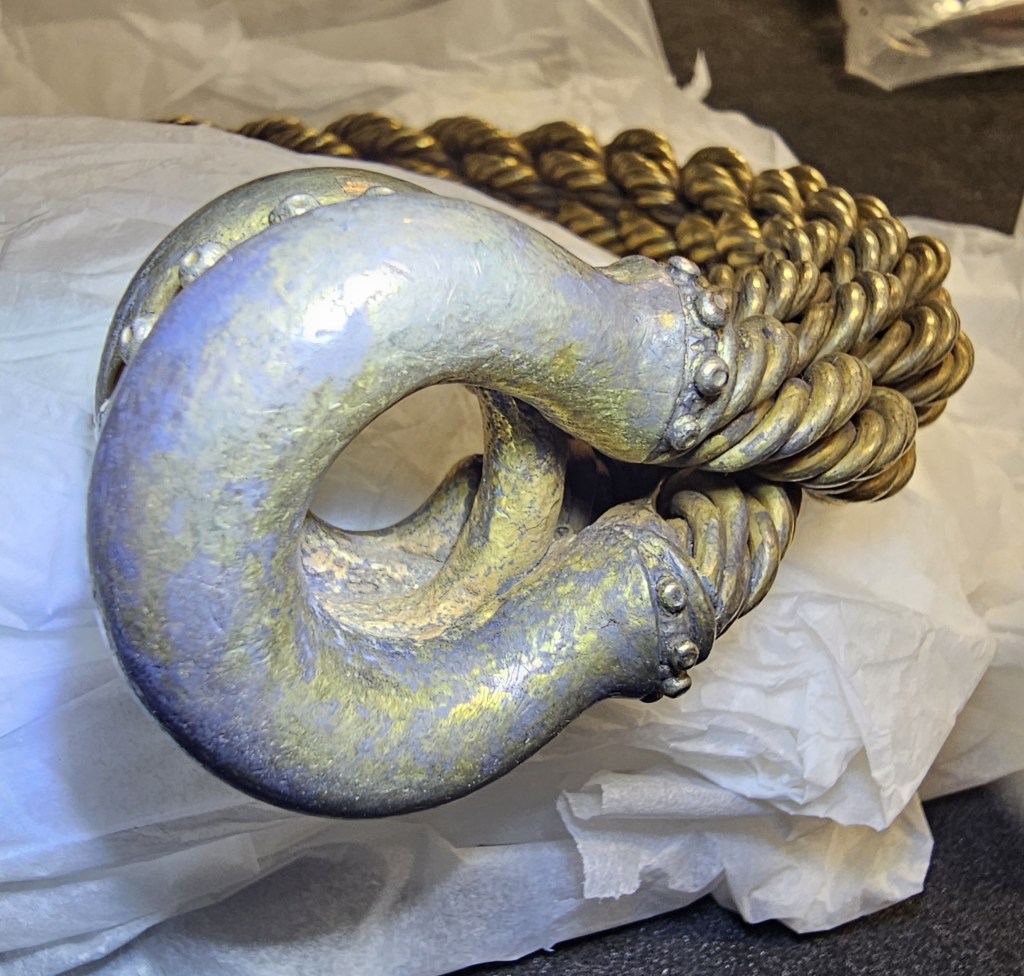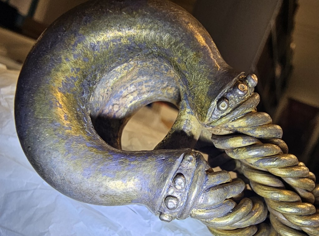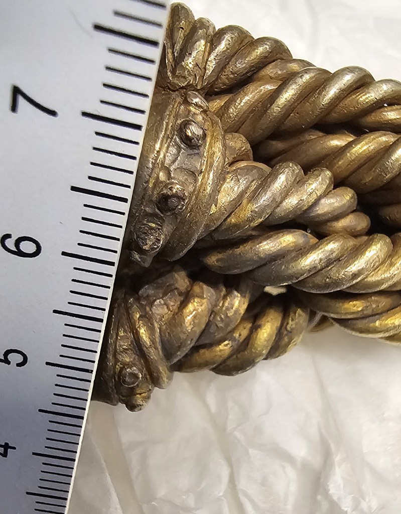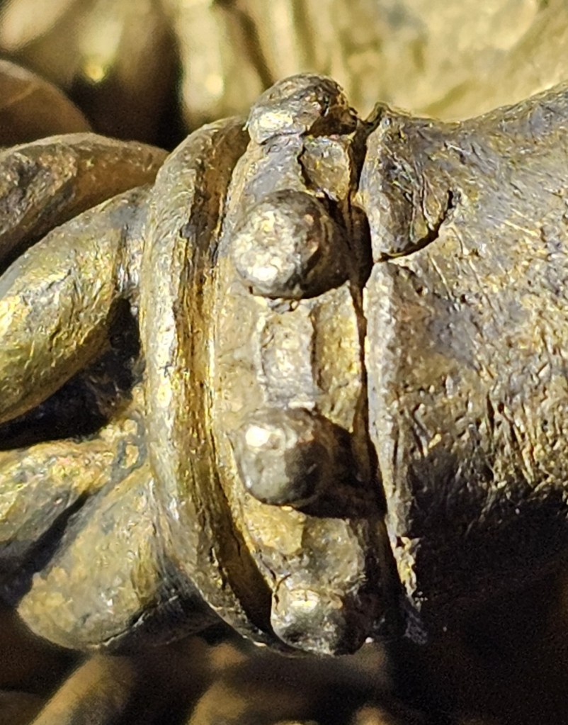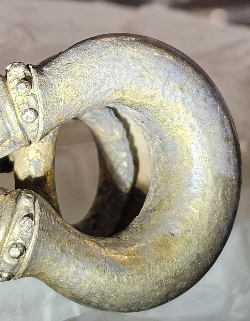 Examination of the interior of the terminals would suggest that the terminals were not created from the wires of the neck ring (as perhaps seen in torcs like Needwood Forest), but were instead made separately, before being attached to the wire neck ring. It is uncertain if the terminals are solid or hollow, although the edge of an apparently hollow area seen in one of the terminals (Fig. 4) might suggest either a failed hollow casting or a hammered edge that was not turned in correctly.