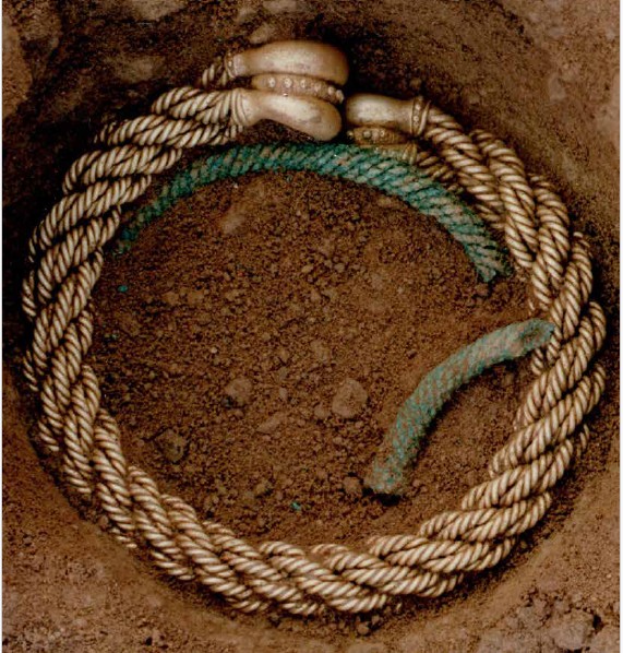 Snettisham torc H7 (British Museum accession number 1991,0407.15 ) was found in 1990, during the British Museum excavations at Snettisham, Norfolk. The torc was located in Hoard H, one of the fourteen hoards located on the site. Full details can be found in the Snettisham hoards publication, Volume 1, page 132. This hoard comprised eleven torcs placed one on top of each other, but apparently in two separate deposits: six torcs in the upper deposit and five in the lower. The pit they were buried in was about 22cm wide, by 16cm deep. Torc H7 was the uppermost torc in the lower deposit of this hoard, and had been compressed to fit the hole, with the torc springing back into shape after removal (Fig. 1).